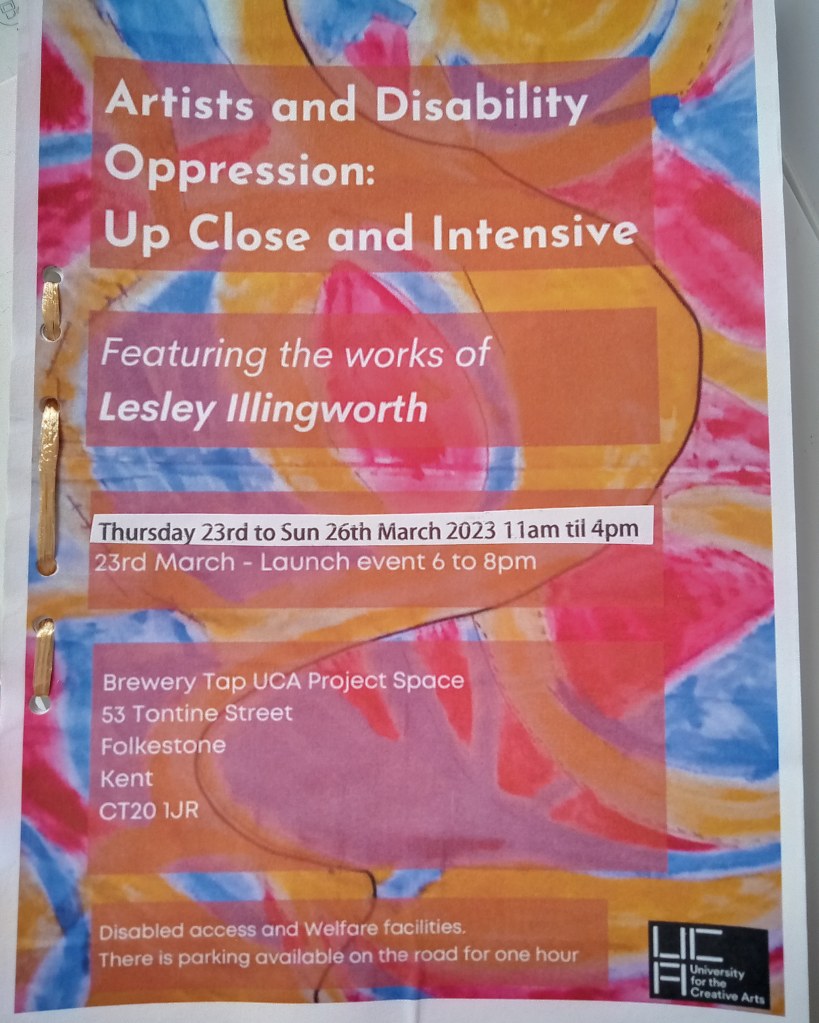 After being re-introduced to activism while studying for a degree in 2015. I became aware of the austerity and benefit cuts imposed on disabled people. While homeless due to lack of social housing in 2016, I made patches for what was to become a story telling coat about disability oppression. When the chance of a bursary from Surrey Disability Arts came up I decided to apply. I wished to continue getting the story of disability oppression into society. I was also experiencing artists oppression on a massive scale. I decided to create a story telling gazebo to help get information about these two oppressions out into the world.